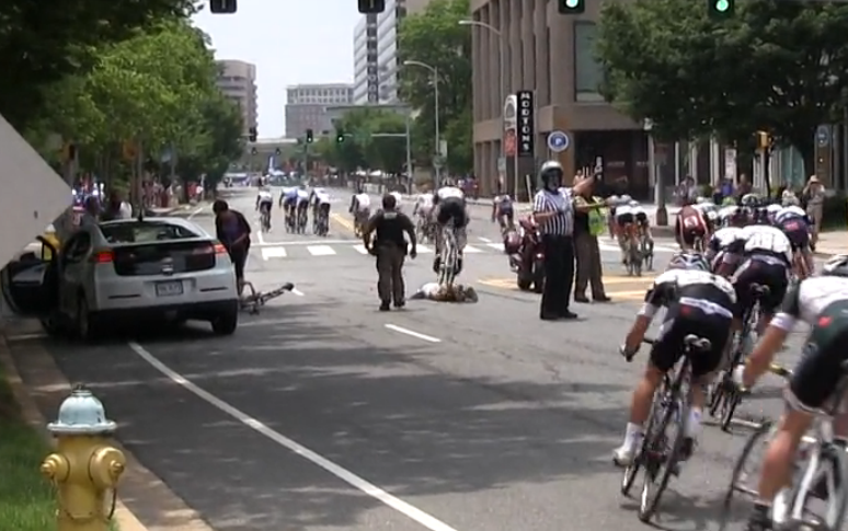 UPDATE: Apparently the first lady wasn’t run over by a car, she was a race official who was run over the bicyclist you can see on the ground next to the car. Frankly, this just makes the whole thing 1000x better.