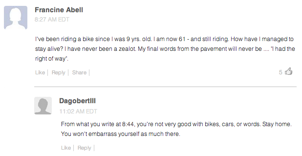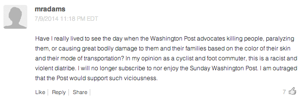 But before I do a victory lap, let’s just take a quick look at the comment section of the article, shall we? I’m sure the bicyclists in our nation’s capital took this in stride, right?