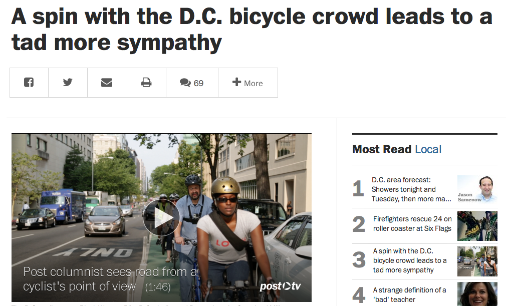 [Washington Post] After writing about how aggravating rude and reckless bicyclists can be for motorists like myself, I was invited by some bikers to see the road from their point of view. ….